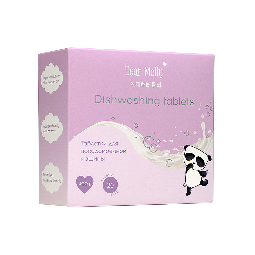 Таблетки для посудомоечной машины - ОписаниеТаблетки для посудомоечной машины Dear Molly отлично справляются с жиром и другими загрязнениями и устраняет неприятные запахи. Средство легко смывается с поверхности посуды, не оставляя следов.