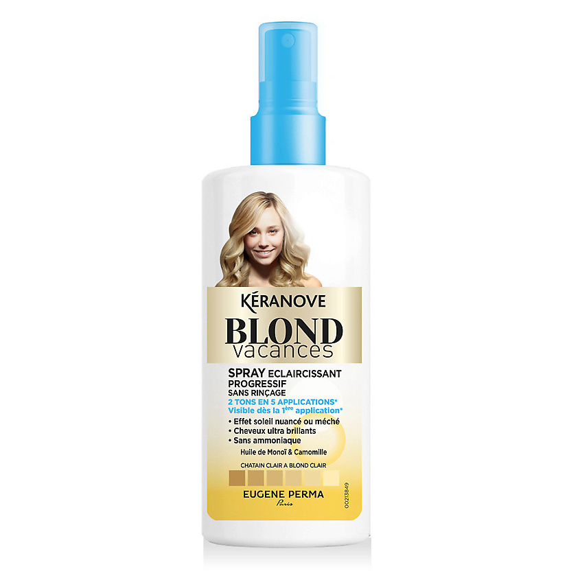 Тонирующий спрей Keranove Blond Vacances обеспечивает легкий и естественный эффект выгоревших на солнце волос, видимый уже после первого применения. Волосы становятся светлее до 2 тонов уже после 5 применений. Придает мягкость и блеск волосам. Рекомендуется применять вместе с гелем и шампунем из этой же серии.